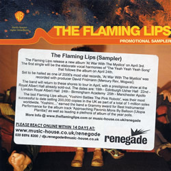 The Flaming Lips - At War With The Mystics new album 3 April The ese Lippy types were in The Spongebob Movie, yikes! Yoshimi, Pink Robots a natural progression to the Spongey one, and now a single The Yeah Yeah Yeahs will be delighted with .. 'The Yeah Yeah Yeah Song' ... out on 24 April, nearly five mins long and already playlisted and much loved The Flaming Lips should find themselves in The Fab Forty, alright pop pickers not 'alf. XXXX www.theflaminglips.com (Posted 18 March) |